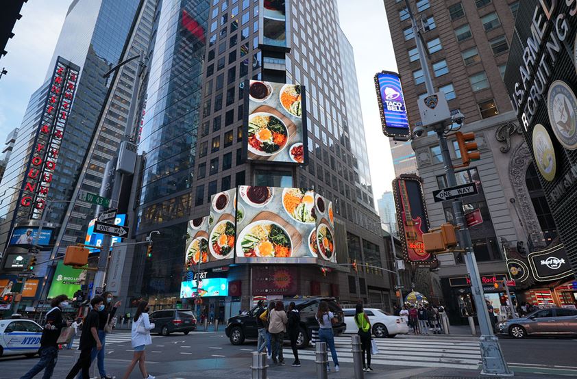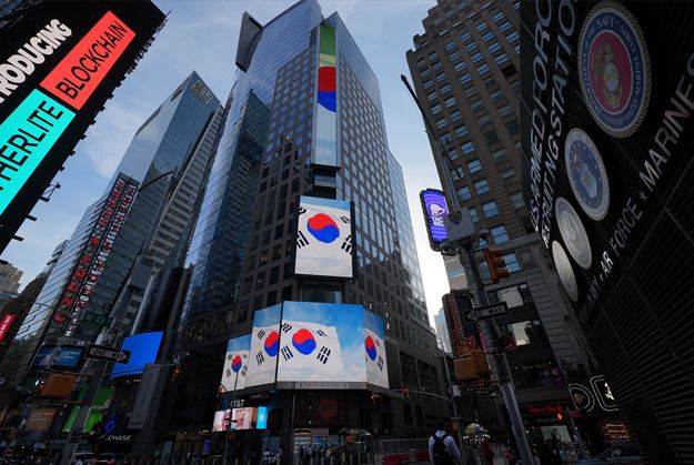 ◆같은 해인 2021년 5월 26일, 미국 뉴욕 타임스퀘어에 중국으로부터 존재를 위협받고 있는 한복, 김치, 비빔밥, 태극기 등 우리의 것이 우리의 것임을 알리는 광고 송출