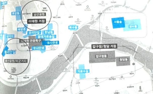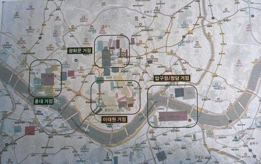 오늘날 서울의 핫플레이스를 4개의 거점으로 나눕니다.